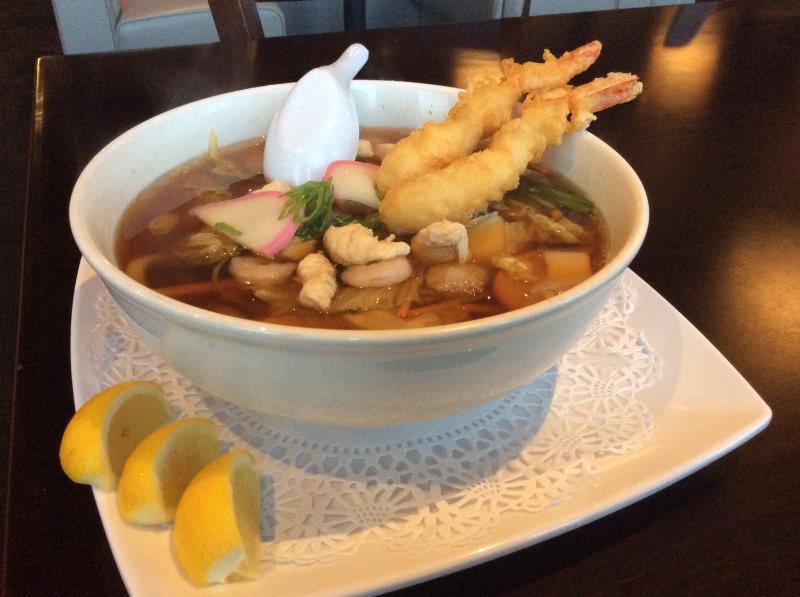 shrimp tempura (2), chicken, vegetables, and noodles in a light broth